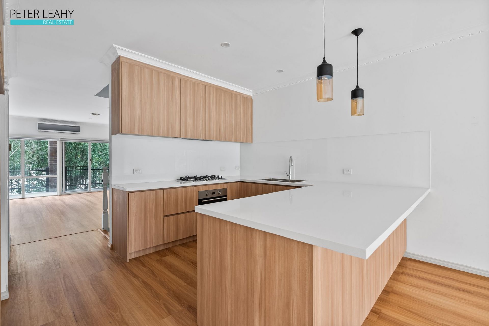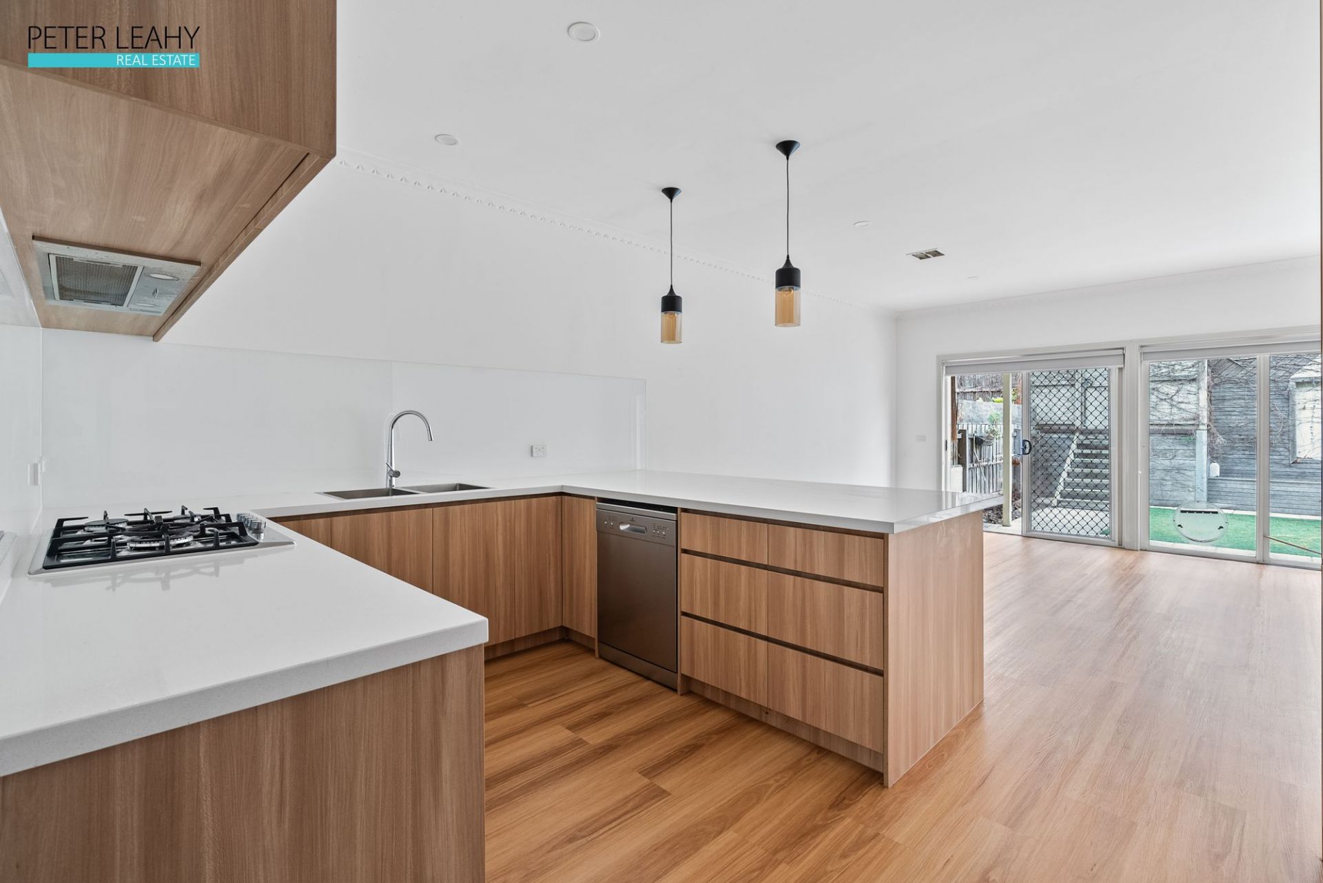 First Level: Open-plan living, dining, and family space; formal meals area leads to a private balcony; contemporary kitchen with stone bench tops, gloss cabinets, and stainless-steel appliances, overlooking a tiled alfresco terrace for entertaining.