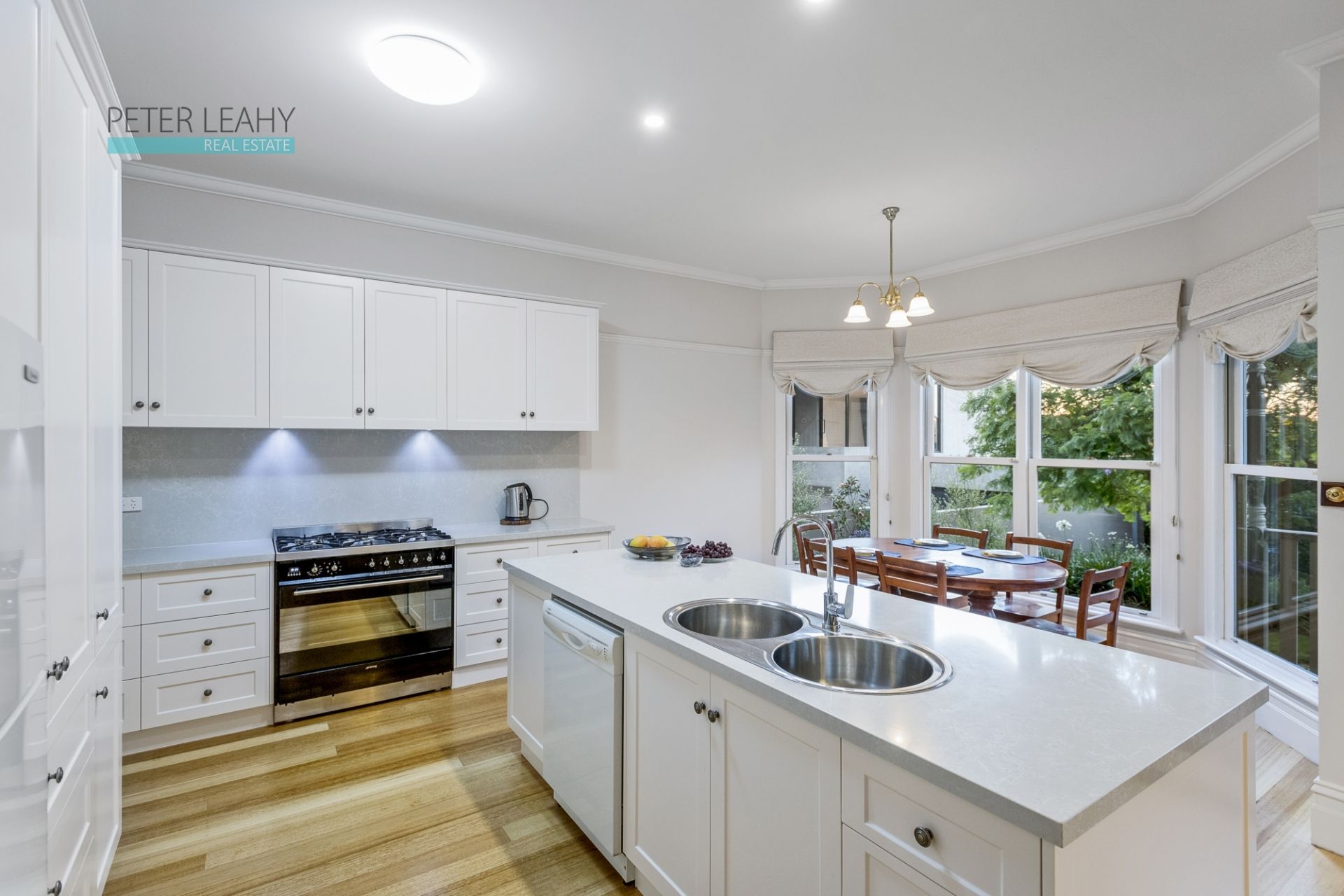 Warm and inviting interiors continue with contemporary open plan living, dining zones and custom designed kitchen, featuring Smeg dual fuel cooker, stone island and copious soft close cabinetry, enjoying abundant natural light and wonderful connection to sun-filled deck, brick-paved alfresco and an enchanting rear garden.