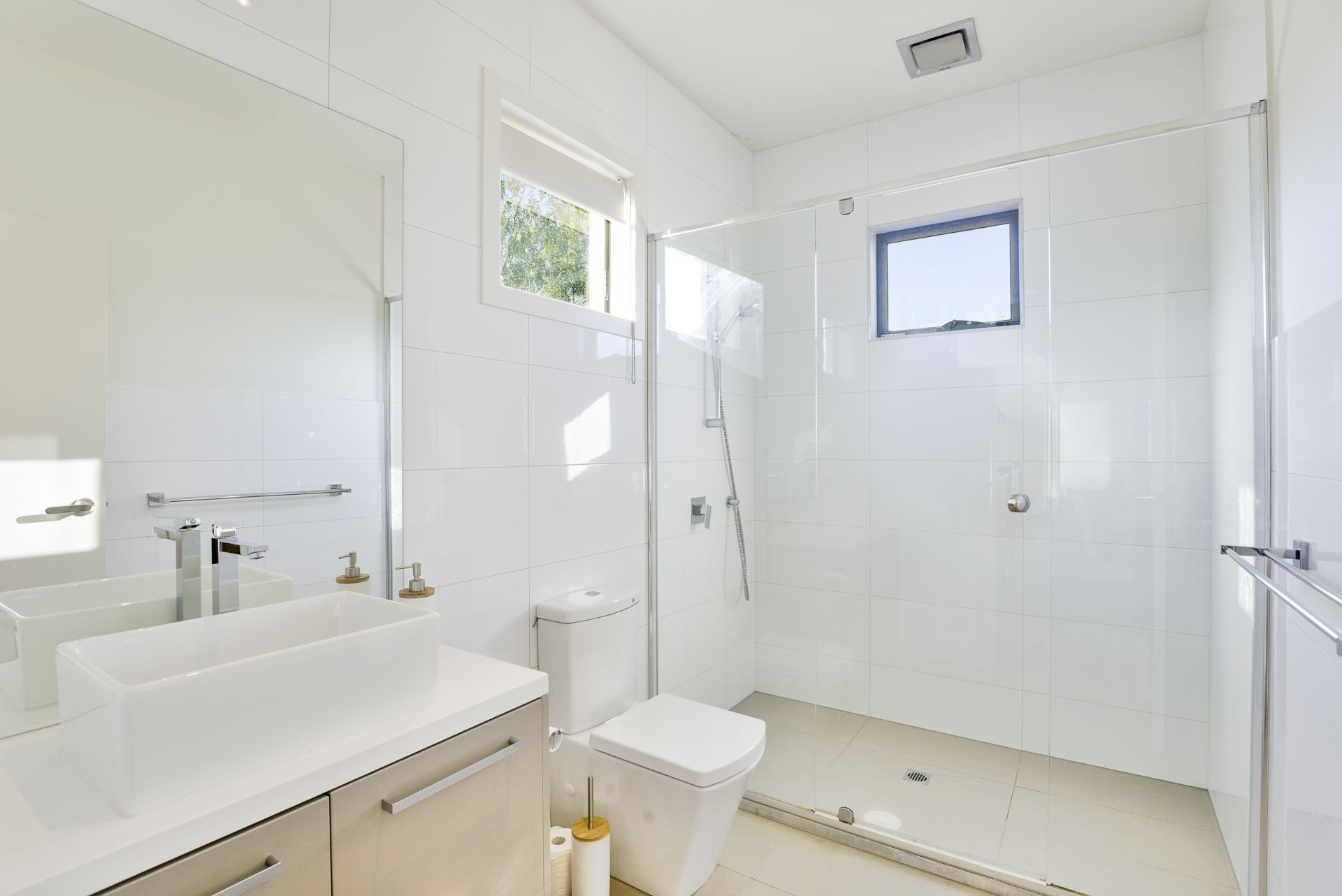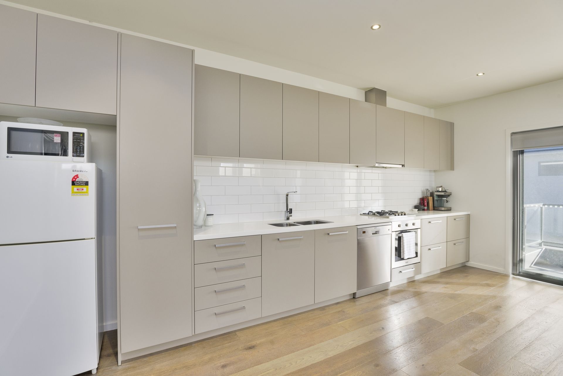 The fully appointed Blanco kitchen includes a full height pull-out pantry and smart white stone counters, also apparent in two bathrooms and a European laundry.